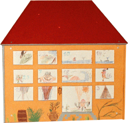 Das Adventshaus wird als Bausatz aus Sperrholz erstellt und lässt sich im zerlegten Zustand das übrige Jahr platzsparend lagern. Zur Adventszeit kann es dann mit wenigen Handgriffen innerhalb von ein paar Minuten aufgebaut werden. Auf normalem Papier wird die Lage der 22 Fenster und zwei Türen markiert, die ausgemalt werden sollen. Ende November bemalen die Kinder dann - oft in tagelanger Arbeit - ihre Fenster und Türen. Die werden dann noch von 1 bis 24 (auf dem Papier) durchnummeriert und anschließend werden die beiden Außenwände mit dem bemalten Papier hinterklebt.