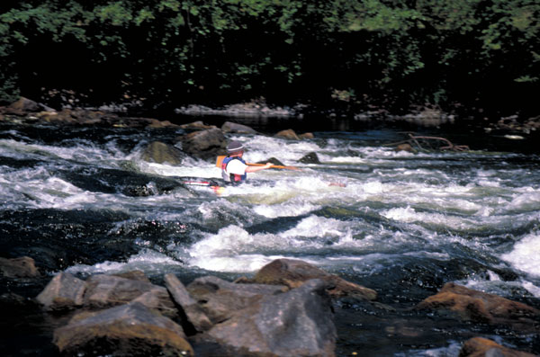 Kurz hinter unserem Startplatz teilt sich der Fluss an einer Insel. Hier sollte jeder mit Gepäck den linken Arm wählen, wer Spaß will, nicht wasserscheu ist und auch kein Gepäck an Bord hat, den Rechten. Ich fahre links vorbei, mein Großer rechts. Die Kanuten von Safaraid werden von ihrem Kanuführer zur Abkühlung durch die rechte Passage geschickt, wahrscheinlich haben sie sich heute um die morgendliche Dusche gedrückt! Am Ende der Insel ist der linke Arm aber auch durch ein kleines Naturwehr versperrt, es bleibt bei dem niedrigen Wasserstand nur eine schmale Durchfahrt für unseren Lastkahn.