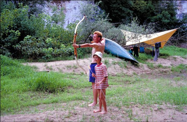 Dann bereite ich das Frühstück vor und wecke meine beiden Männer. Das Baguette ist leider am nächsten Tag immer zäh und pappig, aber wir würden hier in der Nähe ohnehin kein frisches Brot bekommen. Das empfinde ich übrigens als einzigen Nachteil am "Wild zelten". Aber wir haben ja auch noch das Sonnenblumen-Vollkornbrot in den Dosen, das hervorragend schmeckt. Arian stürzt sich nach dem Frühstück sofort auf seine Burg, an der er gestern Abend schon gebaut hat und Sascha schreibt an seinem Brief weiter. Danach bringt Sascha Arian das Bogenschiessen bei. Wir sind auf dieser Tour wirklich schwer bewaffnet! Pfeil und Bogen, Beil, Machete und Kettensäge, alles was ein Kanute so braucht.