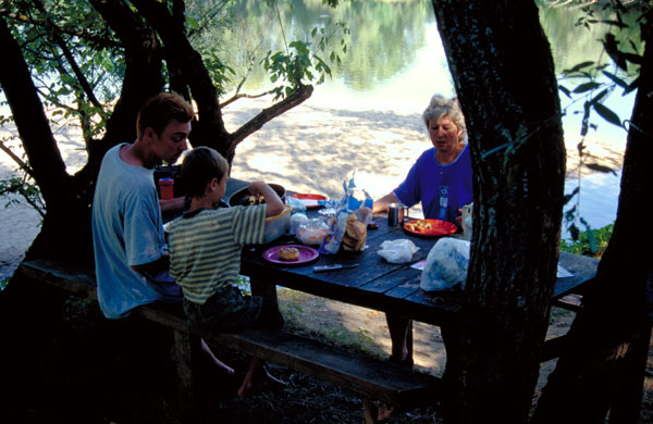 Den Campingplatz "Les Magnanas" am rechten Ufer erreichen wir schon kurz nach 11 Uhr. Hier winkt uns schon das paddelnde Lehrerehepaar aus der Pfalz ans Ufer. So sieht Arian doch noch seine kleine Spielkameradin Barbara wieder. Nachdem unser Zelt steht, mache ich mich mit Sascha auf den Weg nach Beynac, wo wir Baguette, Croissants und Kuchen kaufen. Wieder zurück auf dem Platz wird erst einmal richtig gefrühstückt. Auf dem Nachbarcampingplatz ist die letzte Safaraid-Station an der Dordogne. Die Bustour bis Souillac kostet 45 FF (15 DM) Fahrgeld für "Fremde".