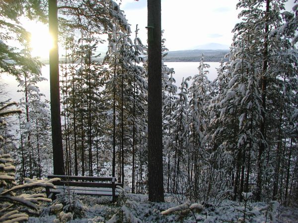 Arian und ich stehen um 8.15 Uhr auf und heizen die Küchenmaschine an. Das Holz ist leider noch etwas feucht und so greifen wir zum Grillanzünder, damit die Küche warm wird. Sascha hat das nicht nötig, sein Zimmer ist dermaßen überheizt, dass er auf, statt unter der Bettdecke liegt. Das Thermometer am Küchenfenster zeigt lediglich -5°C an. Gestern hatten wir erheblich niedrigere Temperaturen, heute ist es dagegen sehr angenehm im Freien. Die Schneehöhe liegt bei knapp 20cm, alle Bäume tragen ein weißes Schneekleid. Da es fast windstill ist, bleibt das Schneekleid auf den Bäumen auch erhalten, ein wunderschöner Anblick! Wenn jetzt noch die Sonne scheinen würde, dann... Regina erscheint jetzt auch auf der Bildfläche und bereitet nach dem Duschen den Frühstückstisch vor. Den Vormittag verbringen wir mit Faulenzen, ich schreibe am Reisebericht. Sascha arbeitet fürs Abitur auf dem Toshiba-Laptop, den Helge extra für ihn mitgenommen hat. Helge geht mit Arian und Sascha auf den zugefrorenen Vikarsjön und bereitet eine Eisfläche zum Schlittern vor. Danach wage auch ich mich auch aufs Eis. Wenn’s bei Helge hält, so trägt es sicher auch mich! Es liegt kaum Schnee auf dem Eis und Helge beschließt spontan, sich in Hede Schlittschuhe zu kaufen. Der Fluss Ljusnan durchfließt hier den See Vikarsjön und hat sich auf über einen Kilometer verbreitert. Gegen Mittag erscheinen Ragna und Knud. Sie holen die Sachen ab, die Cristel und Horst in Berlin für sie besorgt haben. Für ein paar Minuten kommt jetzt sogar die Sonne durch und ich nutze schnell die Gelegenheit für ein paar Fotos. Marina und Regina erledigen die ganze Reisekostenabrechnung, dann bricht Helge mit Regina auf in Richtung Hede. Dort erledigen sie den restlichen Lebensmitteleinkauf für die Weihnachtsfeiertage, Dinge an die wir gestern im Supermarkt nicht dachten.